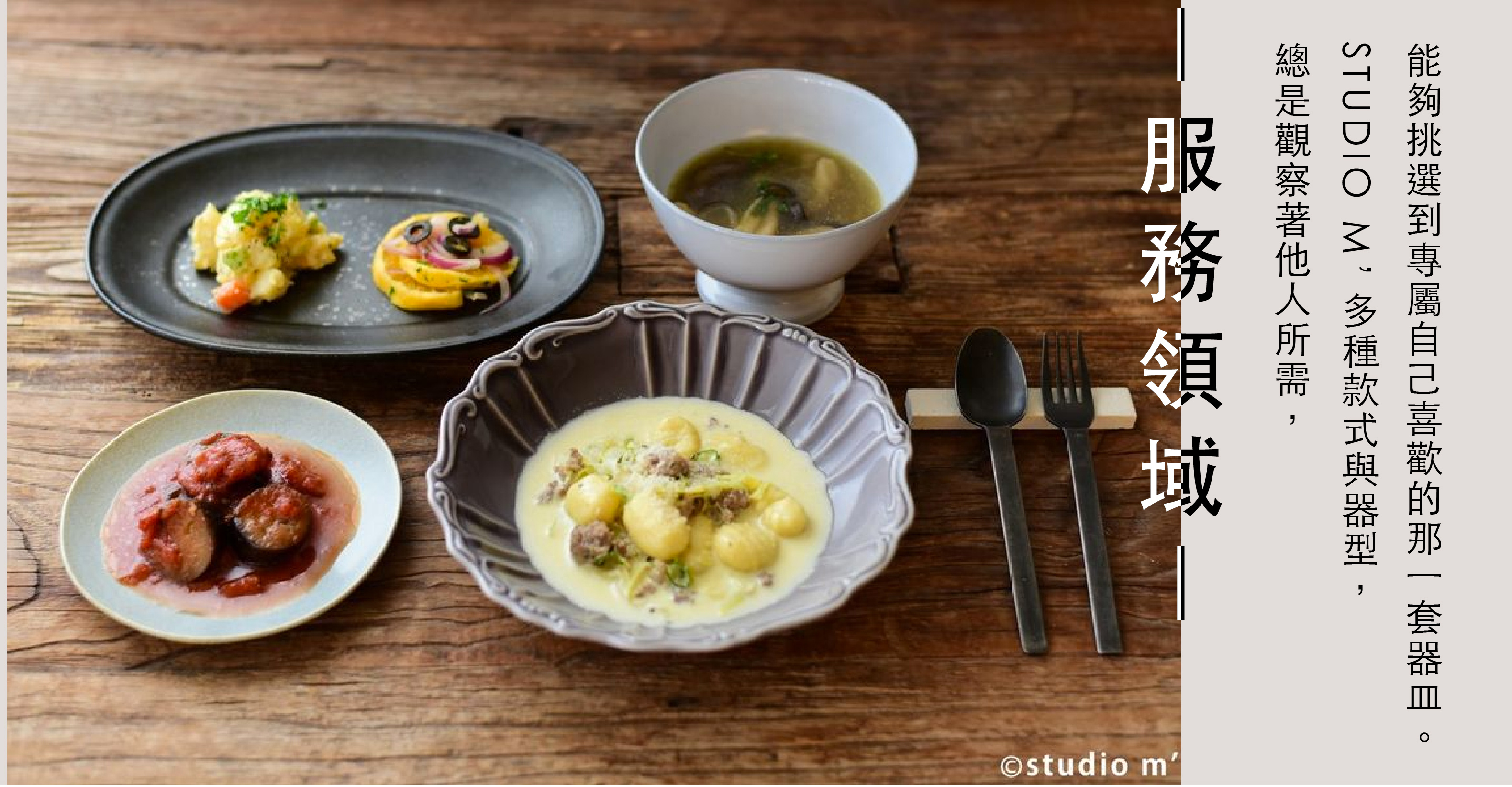 STUDIO M’ 每兩季就會出各種款式的新品。從餐桌器皿、餐具到廚房道具應有盡有,STUDIO M’最想傳達的是「用餐的愉悅時光」,所謂用餐,不僅只是吃飯而已,包括事前的烹調、事後的整理,全都屬於用餐的一部份。從STUDIO M’的器皿世界,挑選最適合自己的一套器皿吧!