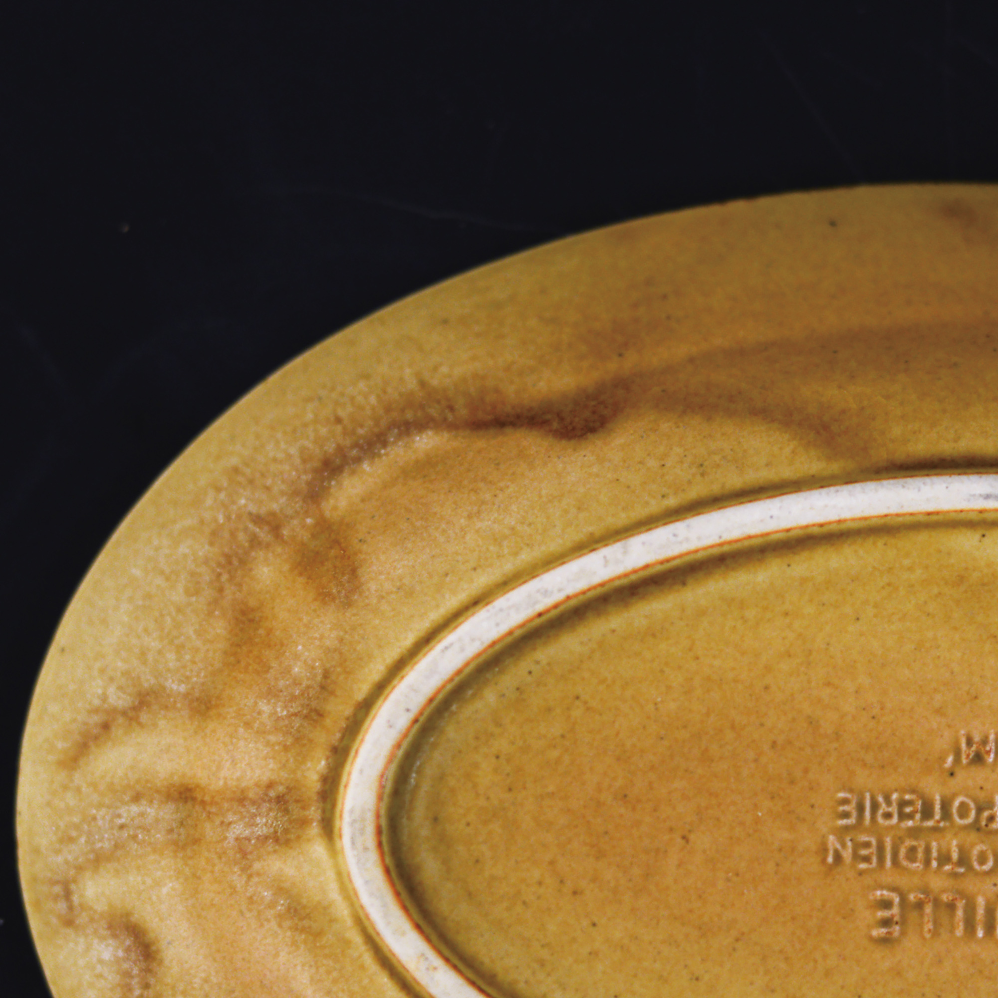 因為手工上釉藥、施化妝土等作業讓釉藥呈現不均勻分布的現象,透過燒製過程中就會產生流釉的狀態。每一件器皿各自呈現不同的流釉樣貌,饒富趣味。